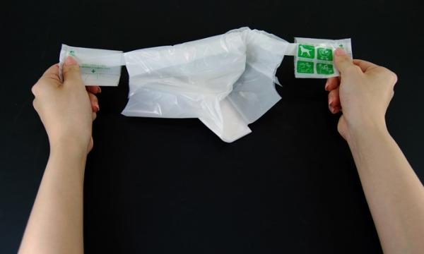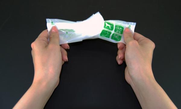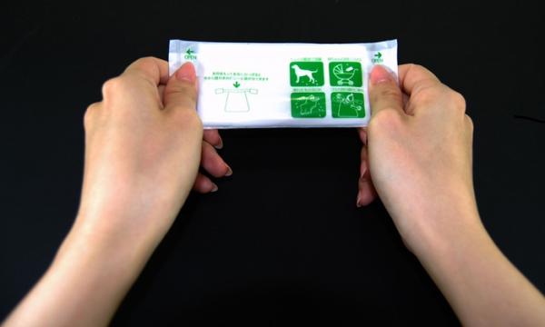 ■開封前は小さく、開封後は大きな収納量の「いきなりポリバッグ」 「いきなりポリバッグ」の開封前の姿は、「紙おしぼり」とほとんど同じ形状(縦52mm×横140mm)で、とてもスタイリッシュ。カバンや上着のポケット、財布に入れて持ち歩くことや、非常時持ち出し袋の中に備えて おく場合など、形状がコンパクトで薄いのでどこに入れても邪魔になりません。