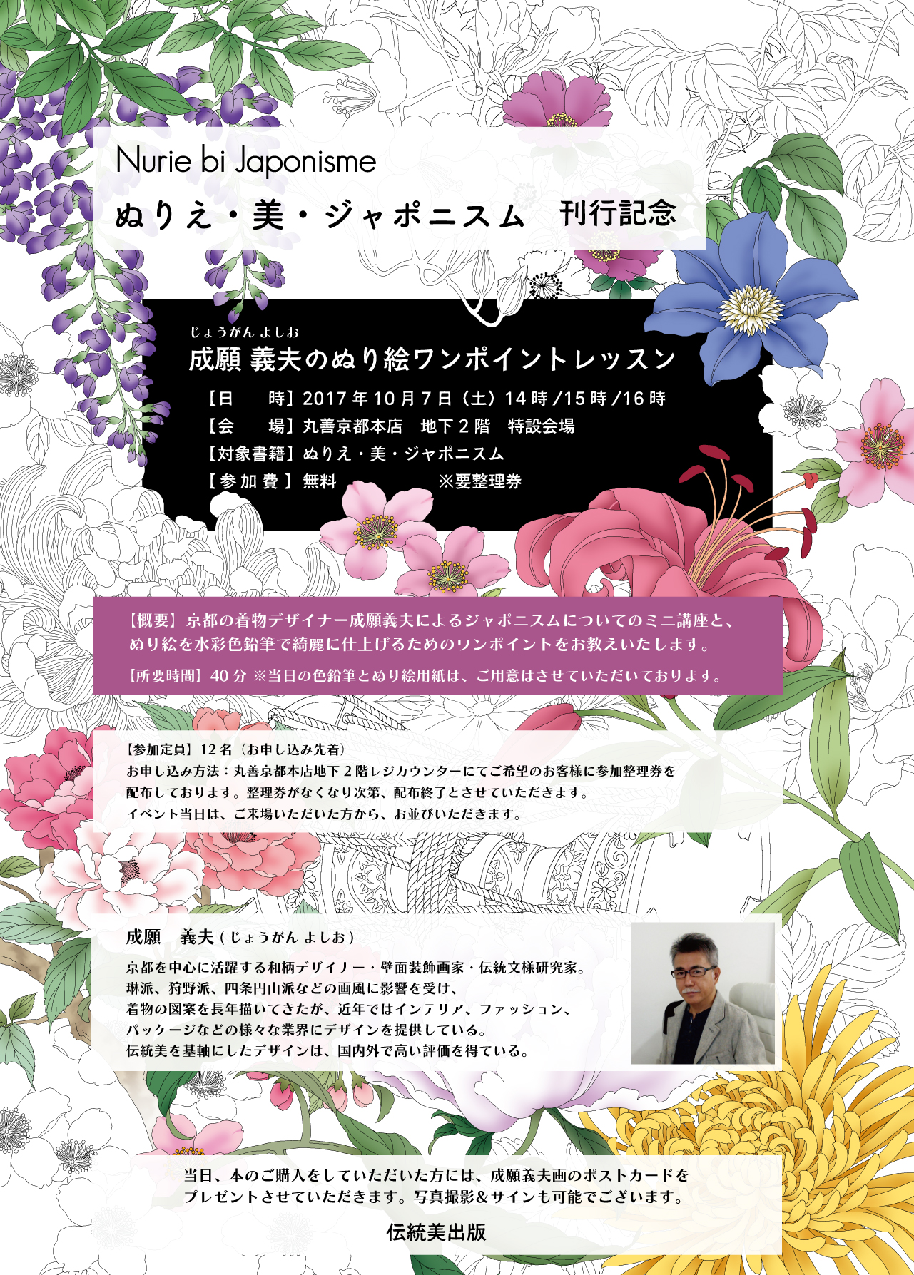 株式会社 京都デザインファクトリーの手掛ける伝統美出版が、2017年10月07日に丸善京都本店にて、新刊【ぬりえ・美・ジャポニスム】の刊行記念イベントを行います。成願義夫によるジャポニスムについてのミニ講座と、ぬり絵を水彩色鉛筆で綺麗に仕上げるためのワンポイントをお教えいたします。