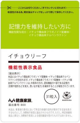 健康家族では記憶力(言葉や図形等を覚え、思い出す能力)を維持したい方に向けてのサプリメントとして20年近くイチョウ葉の働きに着目した<イチョウリーフ>を販売してきました。植物性ソフトカプセルを採用した高品質なサプリメントとして4年連続モンドセレクションを受賞した本製品はお客様から高く評価をいただいています。今回、機能性表示食品として受理。リニューアルし、発売いたします。<イチョウリーフ>は、財団法人日本健康・栄養食品協会の厳しい新基準をクリアした安全性の高い食品だけが取得できる「JHFAマーク」も取得しています。イチョウ葉の取りすぎが気になる方にも安心してお飲みいただけるように、イチョウ葉由来のアレルギー成分ギンコール酸をJHFA規格である5ppm以下をさらに下回る、わずか1ppm以下に抑えています。イチョウ葉エキスを1粒に120mgとたっぷり配合、毎日安心してご利用いただけます。