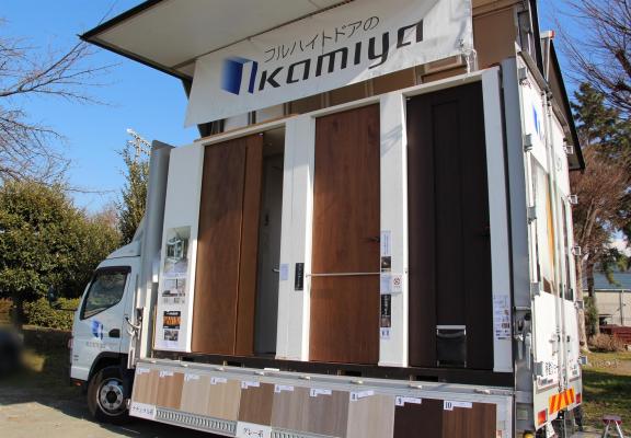 「出前ショールーム 夢はこ」は、『フルハイトドア』を10枚程度搭載し、様々なラインナップが見学できるようになっています。