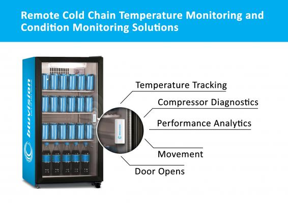 デモでは、温度、振動、磁場、環境光のセンサーを搭載したBluvision社のBEEKSビーコンをクーラーに接続します。ビーコンは、クーラーのリアルタイムの温度と履歴およびクーラー内部のコンプレッサー・モーターからの振動データを含むテレメトリ・データを、Bluzoneクラウド・ソリューションに送信します。