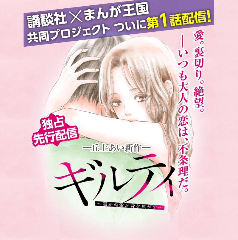 この「ギルティ~鳴かぬ蛍が身を焦がす~」は、女性向けマンガ誌BE・LOVEにて「赤ちゃんのホスト」「ネコろび八起き」を連載していた人気作家 丘上あい先生の新作です。本日の第1話の配信を皮切りに、毎月15日・30日に連載形式での配信を予定しております。
