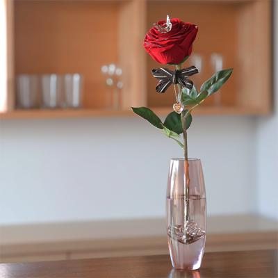 当社の赤いバラは、プレゼントした直後から飾っていただけるようガラス花瓶付きでご用意しています。今回のリニューアルでは英国のLSA社(※3)製のフラワーベースに切り替えました。落ち着いた雰囲気はそのままに、光沢のある色に変えることでバラ全体が華やかな印象に。さらに、樹脂製の凝固剤をお水に見立て、横にしてもこぼれないサプライズ性を持たせています。