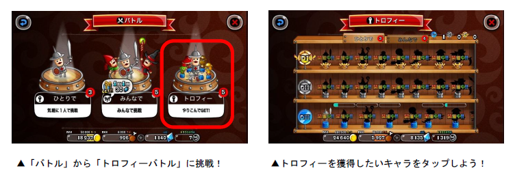各キャラのトロフィーは、「トロP」を一定数貯めると獲得することができます。トロPは「キャラのLvが20以上」「うまP200以上」など、各キャラによって異なる条件を満たした状態でバトルを行なうと獲得できます。また、バトルを開始すると「ボーナスバトル」が発生することがあり、バトルの勝敗に関係なく、獲得トロPが2・3・5・10倍のうちいずれかの倍率で増加します。ボーナスバトルが発生したら、勝利してトロPの大量獲得を目指しましょう!