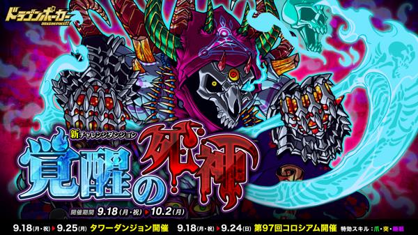 9月18日(月・祝)より、新チャレンジダンジョン「覚醒の死神」が開催!ダンジョンでは、ボスモンスターが1戦目で登場し、プレイヤーの前に立ちはだかります。今回はボスモンスターとして、覚醒進化を遂げた「死霊王ゲヘナ」が登場します。フレンドと協力して強力なボスを倒し、レアアイテムを手に入れましょう!