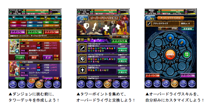 “アタックドライヴならば攻撃スキルに特化”“ヒールドライヴならば回復スキルに特化”など、オーバードライヴにはロール(役割)が決められており、各ロールに対応したデッキの強化ができます。また、タワーダンジョンのボスから手に入る「タワーポイント」を集めると、オーバードライヴの入手や強化ができるので、しっかりと準備を整えてダンジョンに挑みましょう!