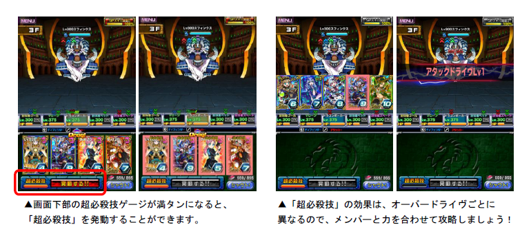 オーバードライヴを装備すると、オーバードライヴごとに異なる「超必殺技」を使用できます。「超必殺技」は、バトル中にダメージを与えたり、ダメージを受けることでゲージが貯まっていき、ゲージが満タンになると発動可能になります。「超必殺技」を効果的な場面で使用し、最上階到達を目指しましょう!