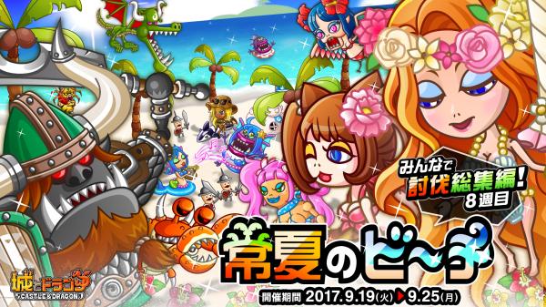 2017年9月19日(火)より、8週連続週替わり討伐イベント「みんなで討伐総集編!」の8週目となる「常夏のビーチ」を開催いたします。みんなで協力して「ビーチ」マップに出現する敵を倒していきましょう!