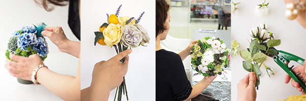 「BasicI(ベーシックワン)」は、アーティフィシャルフラワーを知らない方はもちろん、お花初心者やお稽古事が初めての方でも安心してご受講いただけるフラワーレッスンです。花の基礎を学ぶ本コースでは、アーティフィシャルフラワーの特性・扱い方、道具の種類・扱い方、ワイヤリング、花束の組み方などの技術を習得します。