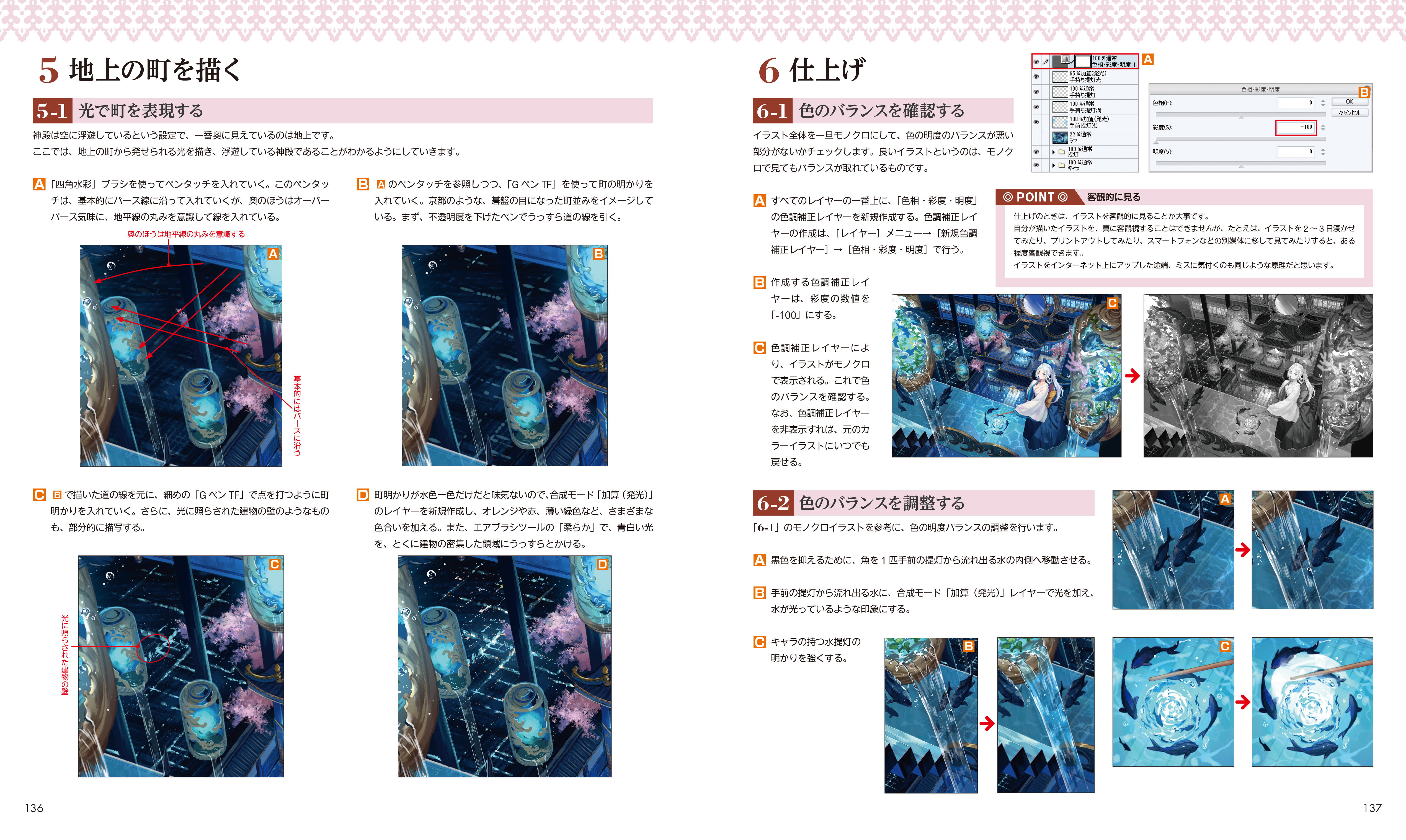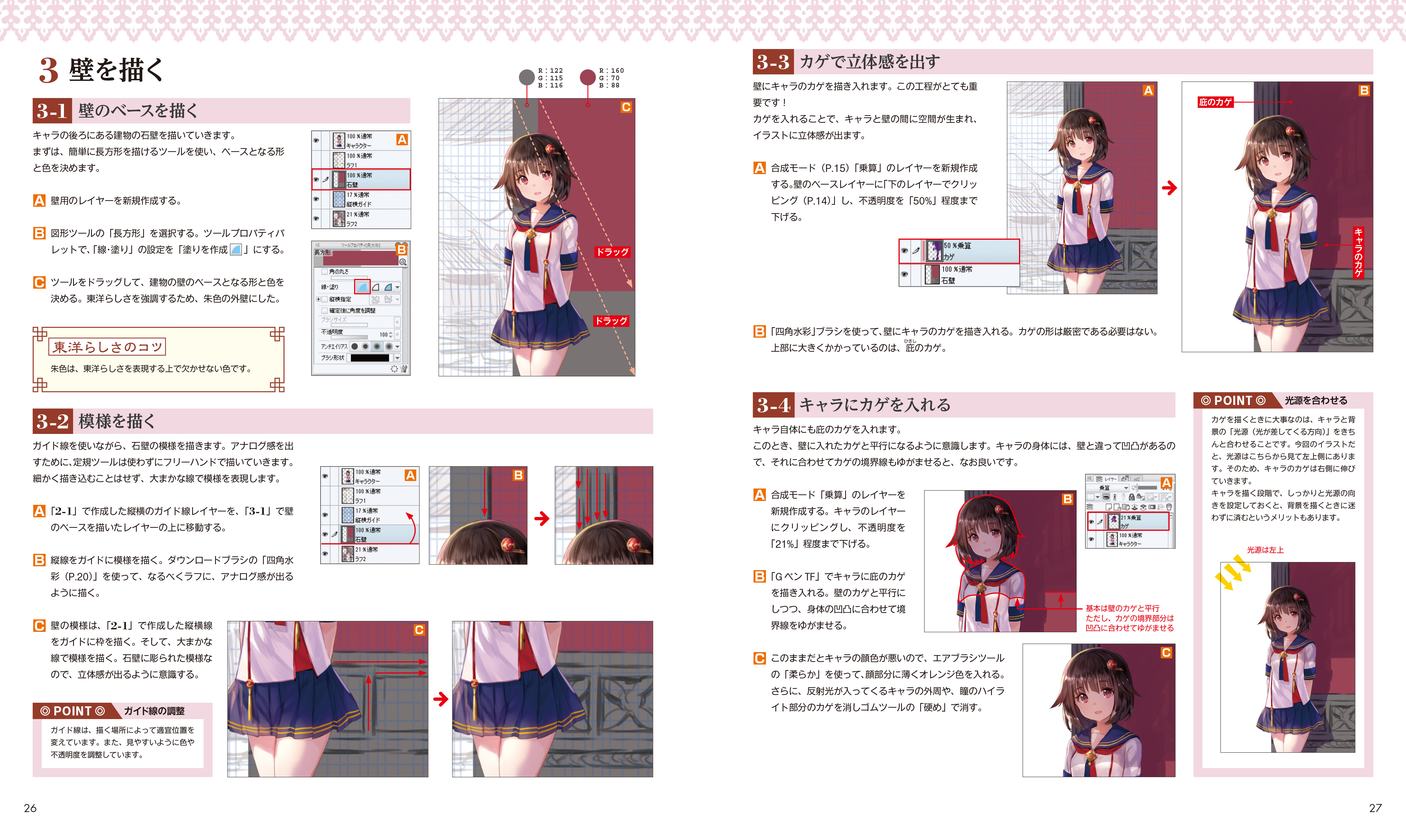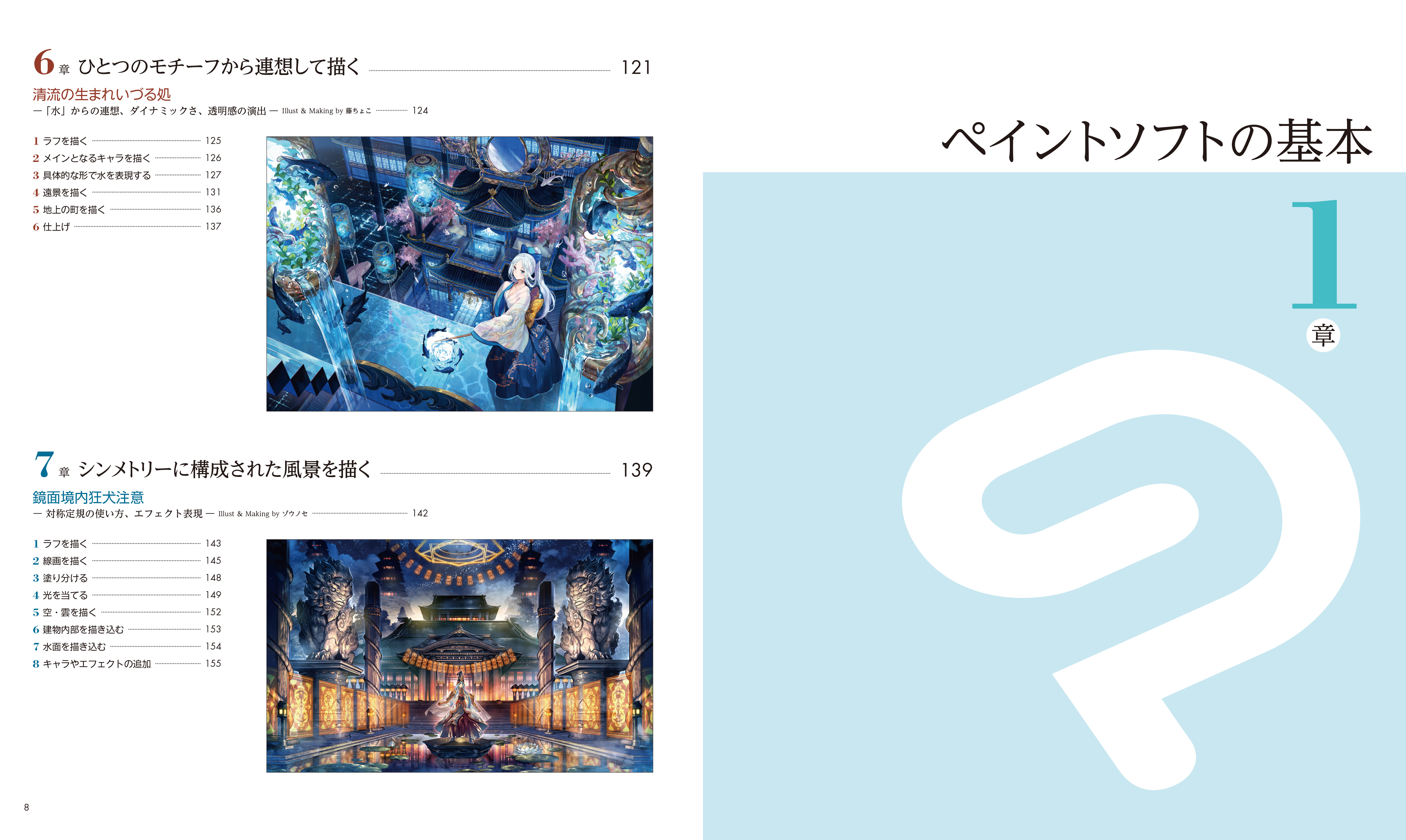 後半では、東洋と呼ばれる国をモチーフとした風景イラストのメイキングを掲載。どのイラストも前半で学んだ「CLIP STUDIO PAINTの使い方」「風景イラストの描き方」の基礎をベースにし、それを応用しながら描いていきます。イラス