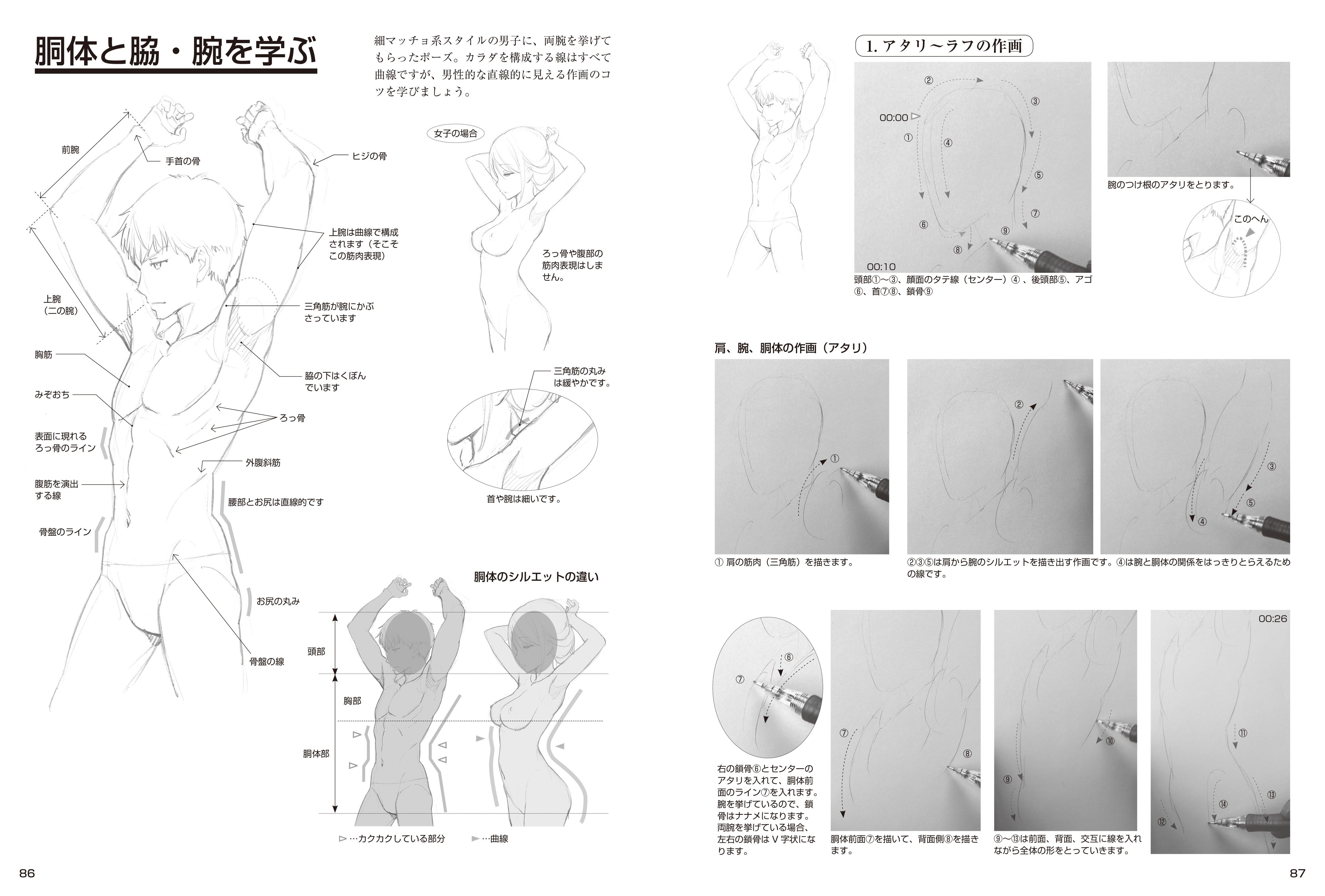 第1章ではキャラデザ、第2章では体の構造を学ぶハダカデッサン、そして第3章では動きの作画を学びますが、重要なことは、森田プロがどこに気を使って描いているか、何を大切にしているか、絵に対する姿勢や線に対する意識を、刻一刻と変化する本書の画面から見て学び取ってください。