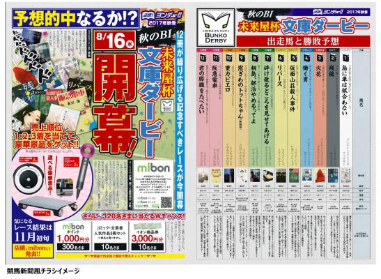 イオングループの株式会社未来屋書店(本社:千葉市美浜区、代表取締役社長:羽牟秀幸、以下 未来屋書店)が開催中のお客さま参加型オリジナルキャンペーン『秋のB1 未来屋杯 文庫ダービー』の投票総数が8月16日の開始以来、9月20日現在で1,000件を突破しましたのでお知らせいたします。