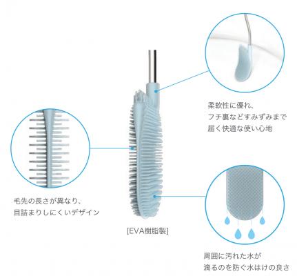 ブラシヘッドに使用した耐久性が高く柔軟性に富んだEVA樹脂は、ブラシの毛羽立ちがなく、可能な限り平たくしたことで、トイレ内部のカーブにフィットして汚れを落とします。また、先端が丸みを帯びたデザインにすることでトイレの奥に届きやすくなり、これまで落とせなかった汚れがきれいに落とせるようになりました。さらに、ブラシヘッド上部側面にも“毛”をつけたことで、便器ふちの下面も簡単に掃除ができます。