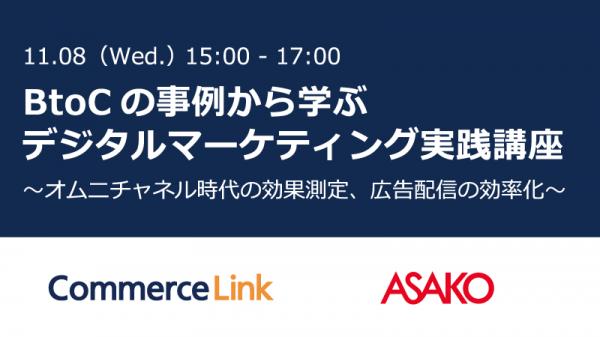 ECサイトの集客・売上拡大を支援するコマースリンク株式会社(本社:東京都大田区、代表取締役社長:藤田 由希子)は、株式会社朝日広告社(本社:東京都中央区、代表取締役社長:上田 周)と共同で『BtoCの事例から学ぶデジタルマーケティング実践講座』と題した無料セミナーを2017年11月8日(水)に開催します。