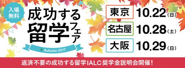 2017年10月に開催される留学フェア(10月22日東京、10月29日大阪、10月28日名古屋)内にて本奨学金に関する説明及びエントリーの受け付けを行います。