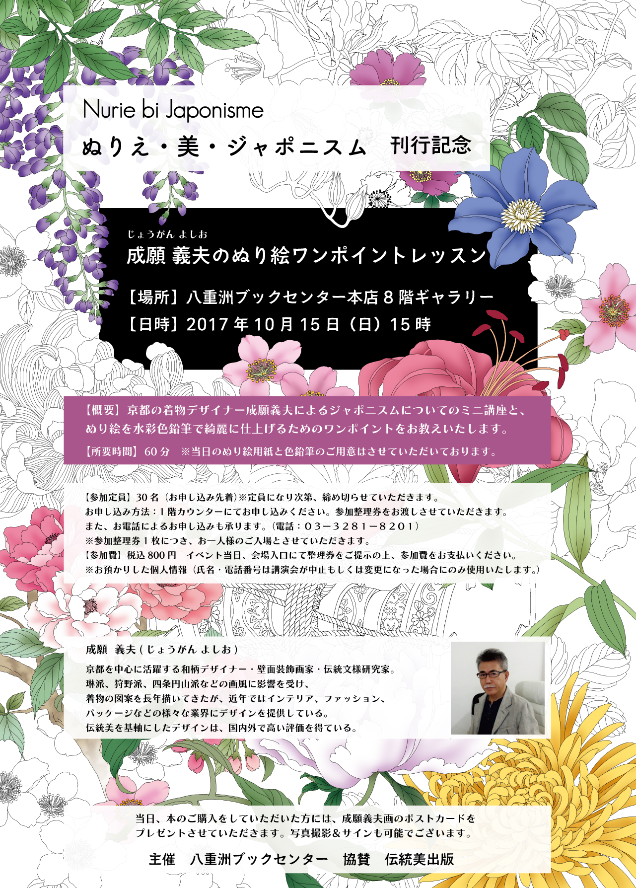 株式会社 京都デザインファクトリーの手掛ける伝統美出版が、2017年10月15日に八重洲ブックセンター本店にて、新刊【ぬりえ・美・ジャポニスム】の刊行記念イベントを行います。著者の成願義夫によるジャポニスムについてのミニ講座と、ぬり絵を水彩色鉛筆で綺麗に仕上げるためのワンポイントをお教えいたします。