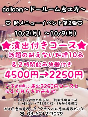 10月2日(月)~10月9日(月)は話題の絶えない演出付きコースが4500円→半額の2250円