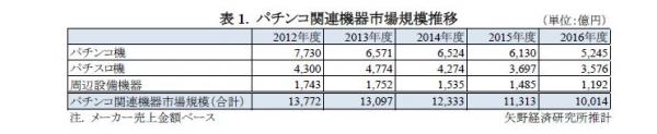 ◆ 2016年度の遊技機市場は前年度比89.8%、2年連続で1兆円を割る
