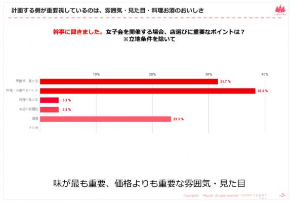 ・女子会開催で重視するポイントは、料理・お酒の美味しさが38.3%と最多で、雰囲気・見た目が31.7%と続き、価格の23.3%を超えた