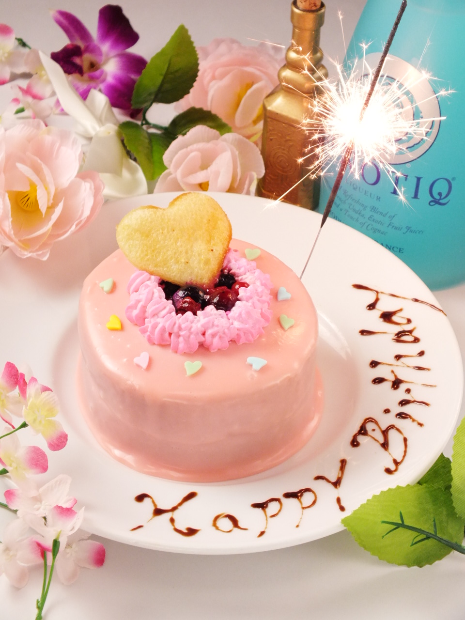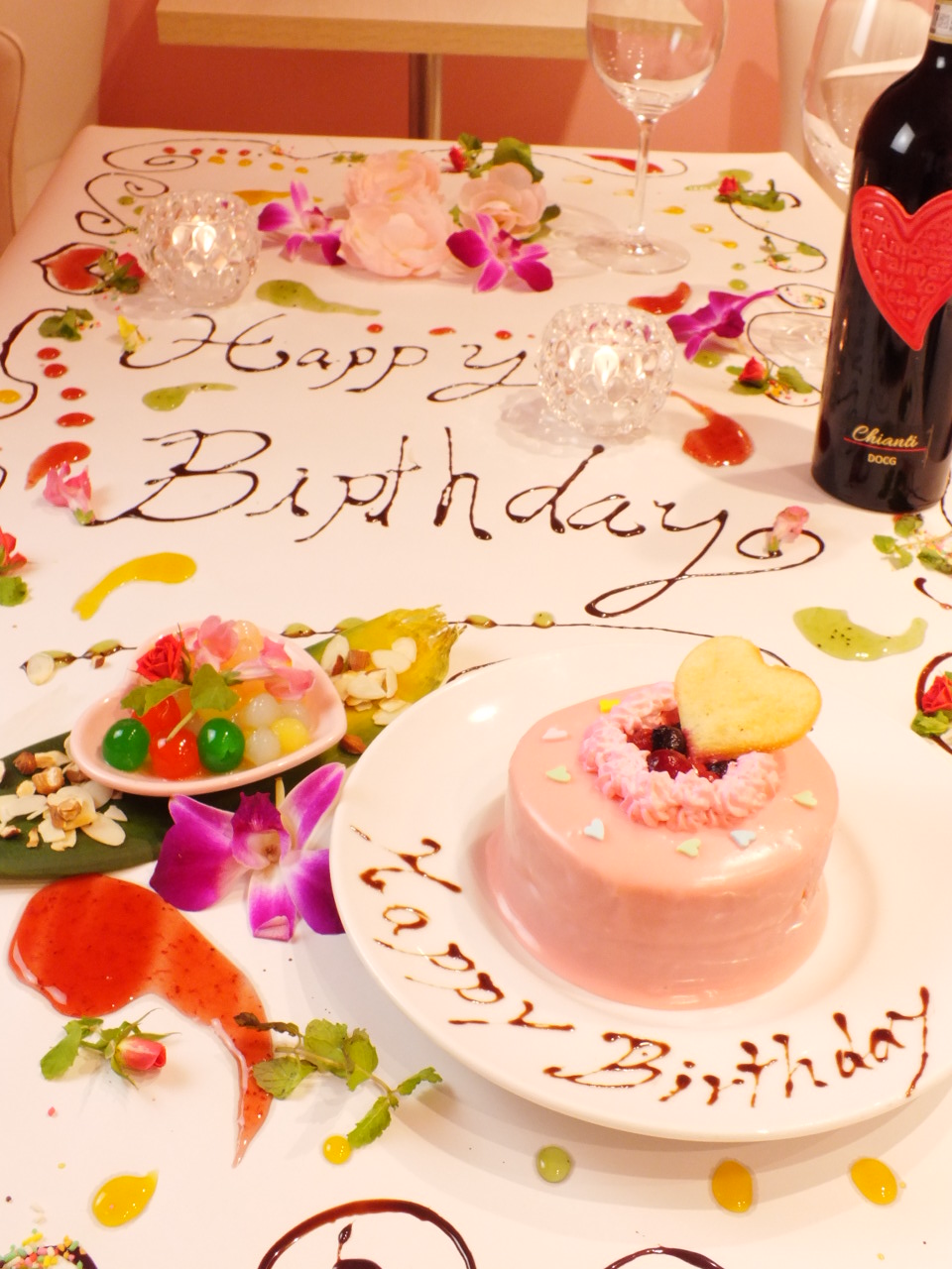 テーブル上に描かれるアート演出、ピンクケーキ、花火、音楽、その他サプライズ多数でご本人や同席者からも笑顔、涙が・・・