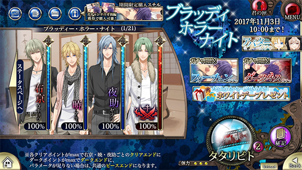 株式会社エレメンツリー(代表取締役:小川 邦弘、所在地:大阪市淀川区)は、2017年10月6日にホラーBLゲーム『[復刻]ブラッディ・ホラー・ナイト』(CV.四ツ谷サイダー、鳩マン軍曹etc)10月イベント『[復刻]ブラッディ・ホラー・ナイト』の提供を開始しました!