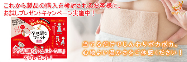今回スタートいたします『不思議なフェルト ミニ』お試しプレゼントキャンペーンは、製品ご購入の前に、「天然鉱石繊維」のじんわり心地よい温かさを体感いただき、納得した上で製品をご購入していただくべくご用意した、ご新規のお客様向けのキャンペーンです。HEATRAY「天然鉱石繊維」製品の公式Webサイト上にて、お申込み受け付けを行っております。
