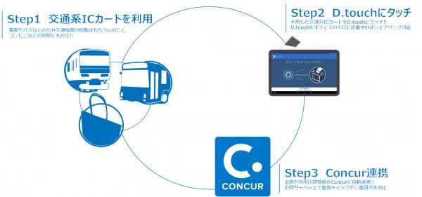 今回提供を開始するD.touchは、電車移動に欠かせないSuica/PASMOをはじめとした交通系ICカードに蓄積された利用区間情報を、専用のAndroidタブレットから読み取り、Concur Expenseに自動連携します。