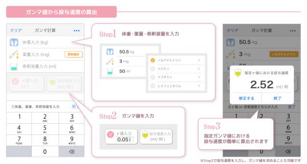 医療従事者は、患者の体重・薬量・希釈液量などの必要な情報を入力するだけの簡単な操作で、ガンマ値から投与速度を算出できるようになります。また、主要薬剤の解説や、過去に行った計算の履歴閲覧機能も備えています。