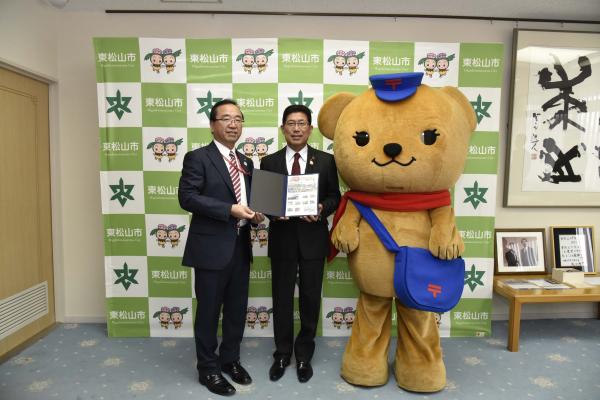 東松山市(森田光一市長)は、10月2日(月)に日本郵便埼玉県西北部地区連絡会(山口実統括局長)から「第40回記念大会 日本スリーデーマーチオリジナルフレーム切手シート」の贈呈を受けました。