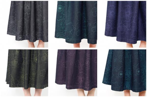 ジャガード織機で織り上げた桜のデニムスカートは「プレーン」「緑染め」「紫染め」「黄染め」「赤染め」「青染め」の6色展開で販売します。着物の染め職人が昔ながらの染色技法で一点一点染めていきます。染色はすべて手仕事で行うため、裏地までしっかりとムラなく染めあがります。