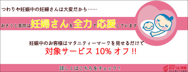 おそうじ革命では、そんな妊婦さんを応援するため、マタニティマークを見せていただくことで、対象サービスの金額より10%OFFさせて頂きます。