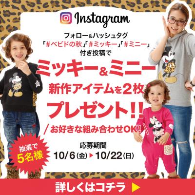 BABYDOLL公式インスタグラムフォロワー様を対象に、キャンペーン#ハッシュタグを投稿して頂いた方から、抽選で5名様に『ミッキーとミニーの新作★秋トップスorロンパース』ををお好きな組み合わせで2点プレゼントします!
