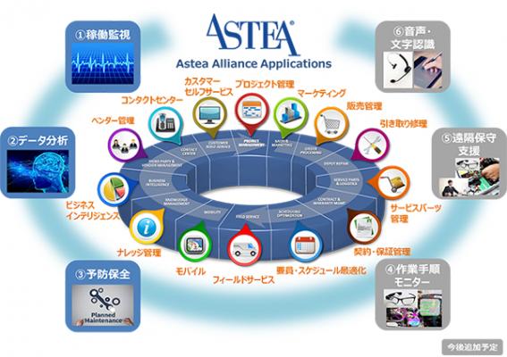 その核となるアステアジャパンの「Astea Alliance」は、フィールドサービスにおけるカスタマーサポート業務全体をカバーしたアプリケーションです。カスタマーサポートを行うコンタクトセンター機能、サービス要員のスキルやスケジュール及び契約条件を踏まえた最適なディスパッチ、現場のサービス要員による作業実績報告や作業報告書作成、顧客による承認等をモバイルで実現するモバイル機能、部品の調達や入出庫、棚卸を行う在庫管理機能、請求機能等を統合して管理する事が可能です。さらには、お客様や部品/サービスの仕入先と連携するポータルサイト機能も実装しています。