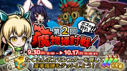 2017年9月30日(土)からクエストカウンター内のボスモンスター討伐数に応じて豪華アイテムが貰える「第2回魔物掃討戦」イベントを開催しております。イベント期間中のみクリアできる限定ミッションの追加や、期間中に倒したボスの種類に応じて様々な冒険に役立つ報酬を獲得することができます!キャラクターの育成などにお役立てください!