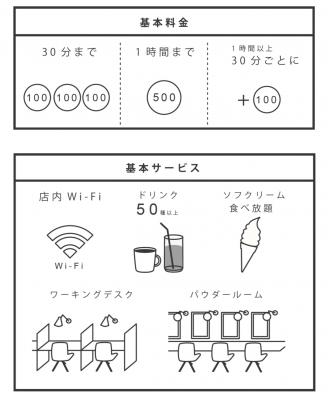 滞在時間に応じた時間課金制で後払い方式です。基本料金内で各種ドリンク、ソフトクリームを無料で提供するほか、店内Wi-Fiや仕事、勉強に適したワーキングデスク、女性用のパウダールームなども時間内に自由に利用できます。