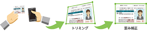 スマートフォンで撮影されたカメラ画像に対して、画像全体から免許証領域のトリミング、カメラ画像特有の歪み補正、文字認識が行えます。
