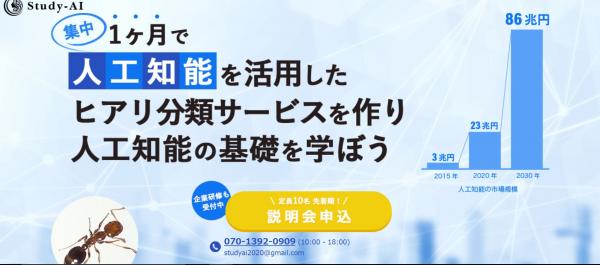 Study-AIでは「1か月で人工知能を活用したヒアリ分類サービスを作り人工知能の基礎を学ぼう」の説明会を開催いたします。