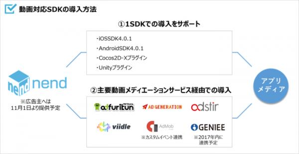 導入に際しては1つのSDK(※2)で動画広告と既存のバナー広告両方の広告配信が可能で、UnityやCocos2d-xのプラグインも提供しています。また、アプリ動画市場では動画メディエーションサービスを経由した配信も想定されることから、リリース時点で5つの主要動画メディエーションサービスとの接続を完了しており、該当メディエーションサービスの利用メディアは簡単に「nend」の動画広告が配信出来るようになります。