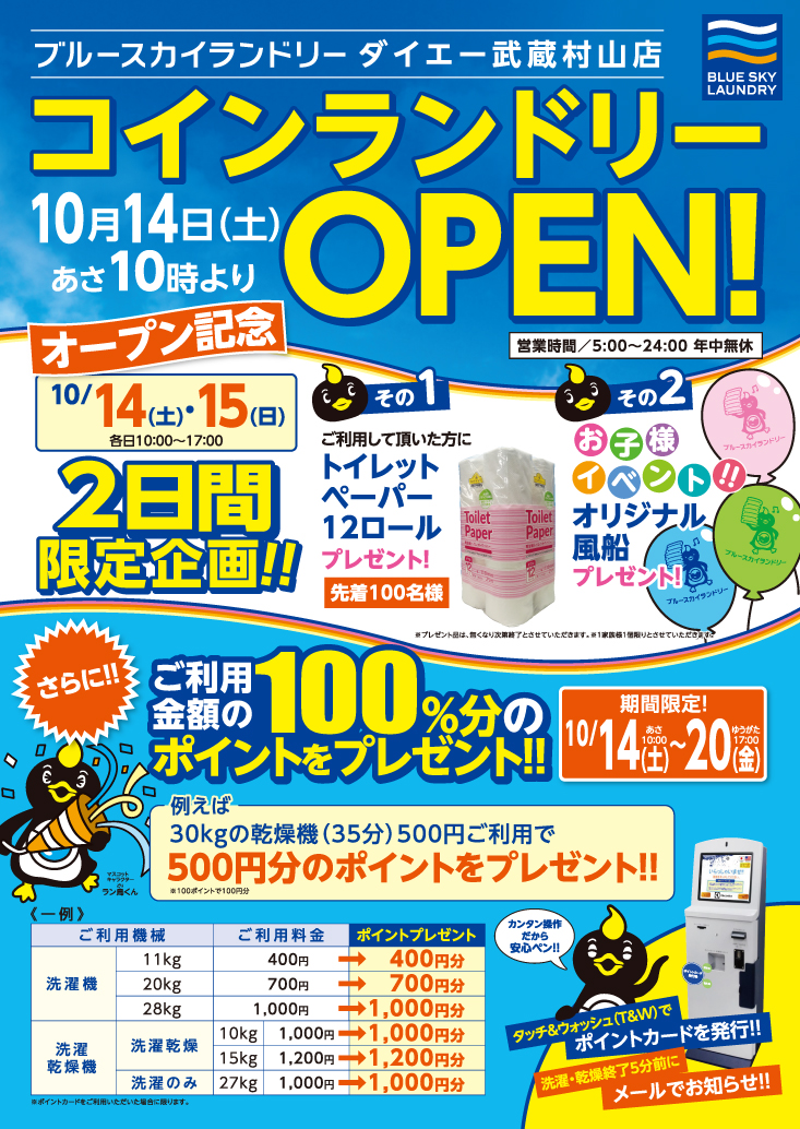 私たちブルースカイランドリーは、大手商業施設敷地内にコインランドリーを集中出店しております。この度2017年10月14日(土)より東京都武蔵村山市のダイエー武蔵村山店駐車場敷地内に東京都内第1号店となるブルースカイランドリー武蔵村山店をオープンします。ブルースカイランドリーの特徴は午前中の3時間パートが常駐しており店内の掃除やお客様への接客を行い利用者の皆様に綺麗で快適な店舗をご提供しております。