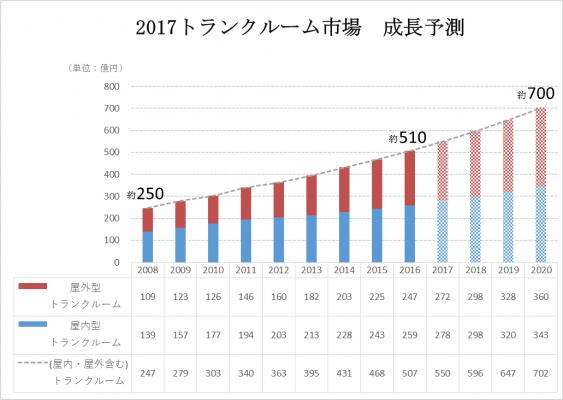 トランクルーム市場は、近年のメディア露出の増加・サービス認知度の向上とともに市場規模は拡大の一途を辿り、店舗数は市場全体で全国8,000店舗に達し、ファミリーレストランの店舗数(約9,700店舗※1)に匹敵する規模へと大きく拡大しました。延べ室数は37万室を超え、約510億円の市場規模へと飛躍的な成長を続けています。現在の市場拡大が続くと仮定した場合、東京オリンピックが開催される2020年には700億円を超える市場へと成長する可能性を秘めています。