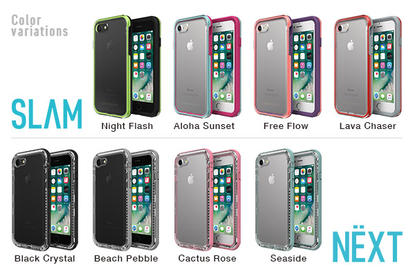 耐衝撃ケース『SLAM for iPhone 8/8Plus』からは「NIGHT FLASH」「ALOHA SUNSET」「LAVA CHASER」「FREE FLOW」の4色、防塵・防雪・耐衝撃ケース『NEXT for iPhone 8/8Plus』からは「BLACK CRYSTAL」「BEACH PEBBLE」「SEASIDE」「CACTUS ROSE」の4色のラインナップで展開致します。なお、『SLAM for iPhone 8/8Plus』『NEXT for iPhone 8/8Plus』ともに、iPhone 7/7Plusでもご使用いただけます。