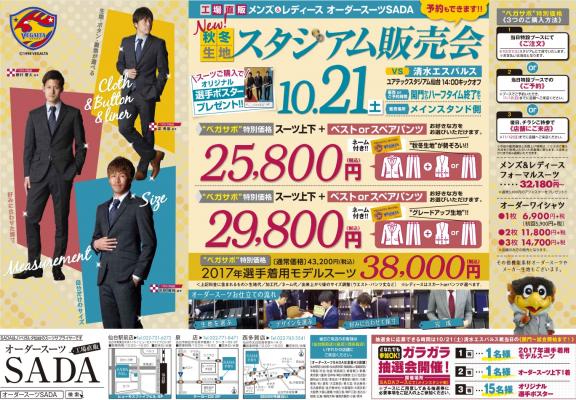 工場直販オーダースーツSADAは10/21(土)にユアテックスタジアム仙台にて「オーダースーツスタジアム販売会」を開催致します。スタジアム販売会に際しまして、2017年モデルのベガルタ仙台公式オーダースーツを発売致します。オーダースーツSADAは、スーツサプライヤーとして2017年シーズンもベガルタ仙台を応援致します。