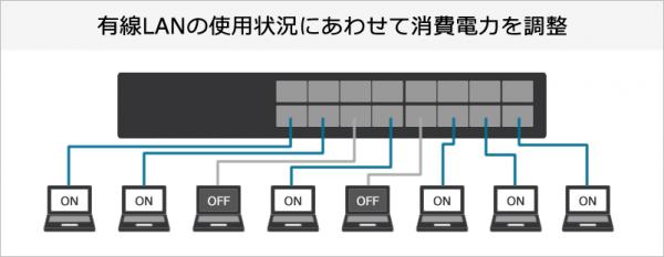 有線LANの使用状況にあわせて消費電力を調整する、『EEE(Energy Efficient Ethernet)』に準拠。未使用ポートへの供給電力を制限する『LPI』機能と通信量によって伝送速度を調整しチップの消費電力を抑える『RPS』機能により、使用状況に応じて消費電力を自動で調整しますので意識することなく無駄な電力消費を抑えることができます。