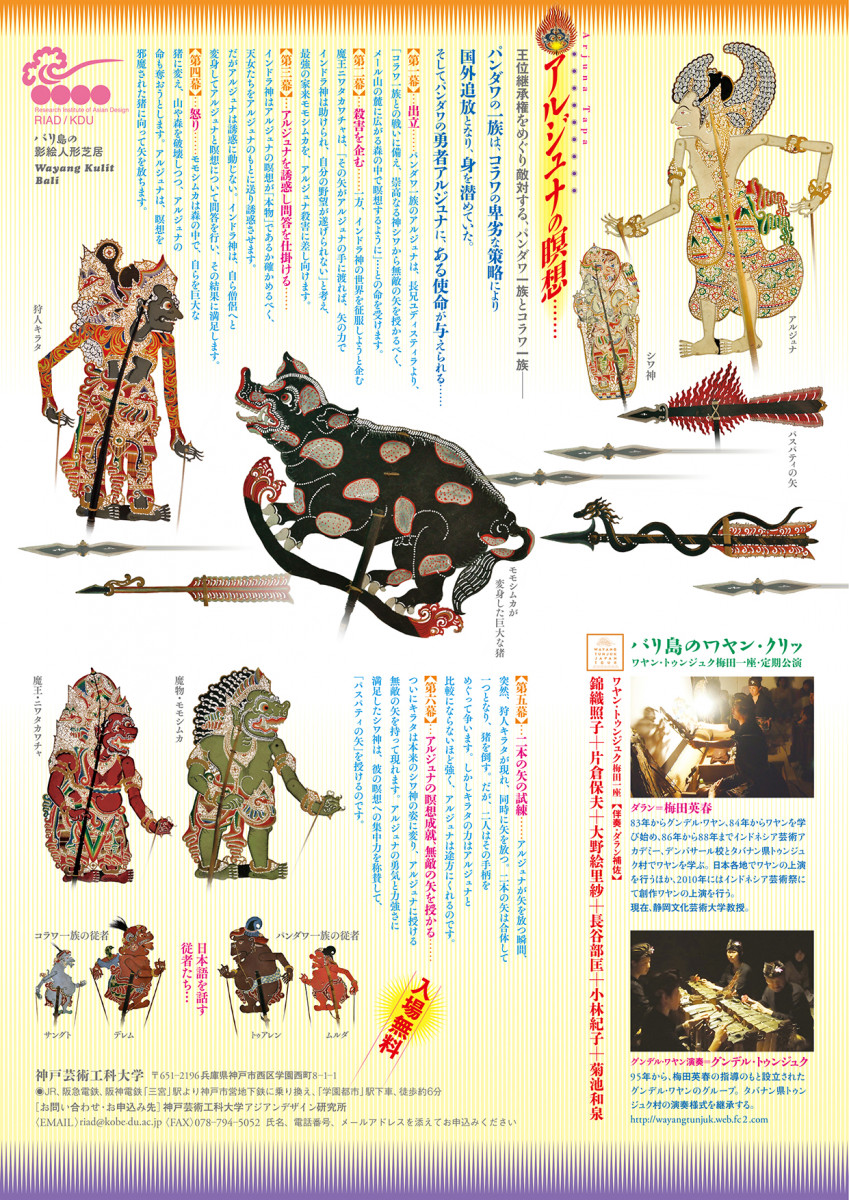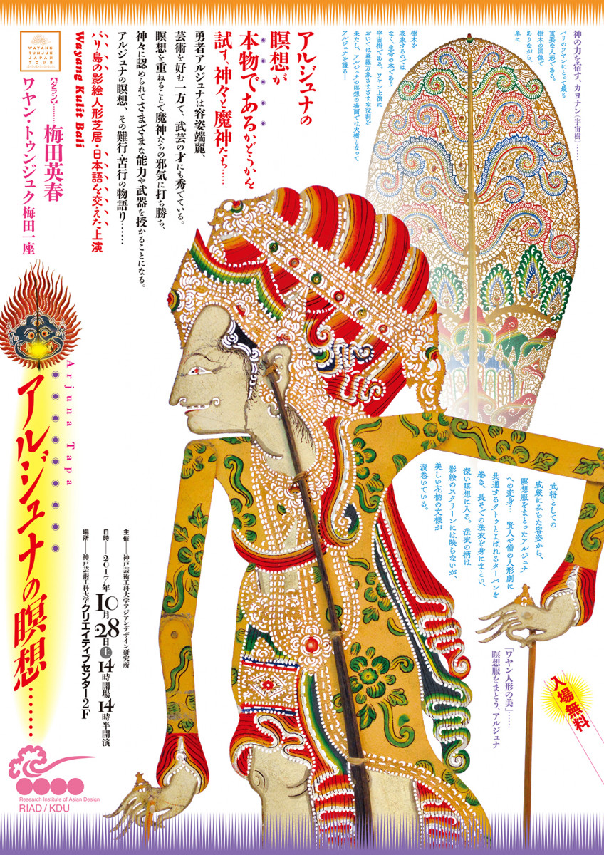 学校法人谷岡学園 神戸芸術工科大学(神戸市西区、学長:齊木崇人)アジアンデザイン研究所(所長:杉浦康平)において、バリ島の影絵人形芝居「アルジュナの瞑想…」の公演を開催いたします。先着70名様に一般無料公開いたします。