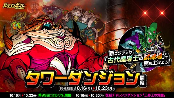 10月16日(月)メンテナンス後より、全100層の高難易度ダンジョン「タワーダンジョン」を開催いたします。また、150レベル以上から参加可能なタワーダンジョンの新コンテンツ「古代魔導士の試練場」のβ版も同時開催いたします。クリアするとさまざまな報酬がもらえますので、ぜひチャレンジして、報酬を手にいれましょう!