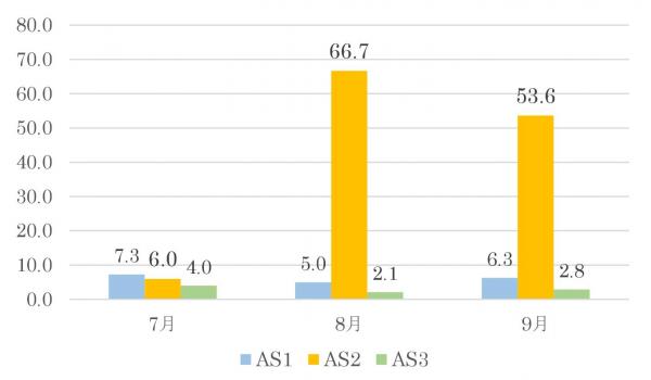7月における攻撃ホスト数は、いずれのASも攻撃ホスト指数が4.0~7.3となっておりあまり大きな変化は見られません。しかし、8月に入るとAS2の攻撃ホスト指数が約10倍へ急増し、9月も高い数値で継続しています。このことからAS2において8月以降、ウイルス感染機器が急激に増加、もしくは既に感染していた機器が攻撃者のコントロールによって活動を開始したものと推測されます。