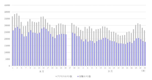 下記は2017年8月~9月の日次のアクセスホスト数、攻撃ホスト数の推移です。