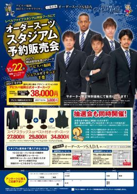 工場直販オーダースーツSADAは10/22(日)にレベルファイブスタジアムにて「オーダースーツ販売会」を開催致します。スタジアム販売会に際しまして、2017年モデルのアビスパ福岡公式オーダースーツを発売致します。オーダースーツSADAは、スーツサプライヤーとして2017年シーズンもアビスパ福岡を応援致します。