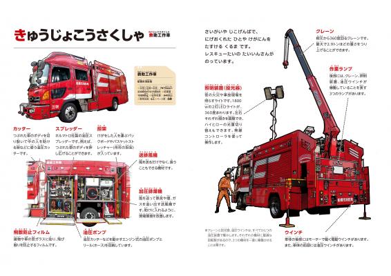 本格的なイラストをつかった消防車の絵本です。イラストが大きく、ルビ付きなので、3歳から楽しんで頂けます。15種類の消防車のはたらきを、こどもが一人でも読める文章ゾーンと、おとながこどもに読み聞かせるための解説文章ゾーンに分けてご紹介しています。ぜひ、親子のコミュニケーションツールとして活用いただき、いっしょにお気に入りの消防車を見つけてみてください。最後のページには「ぬりえ」もついています。