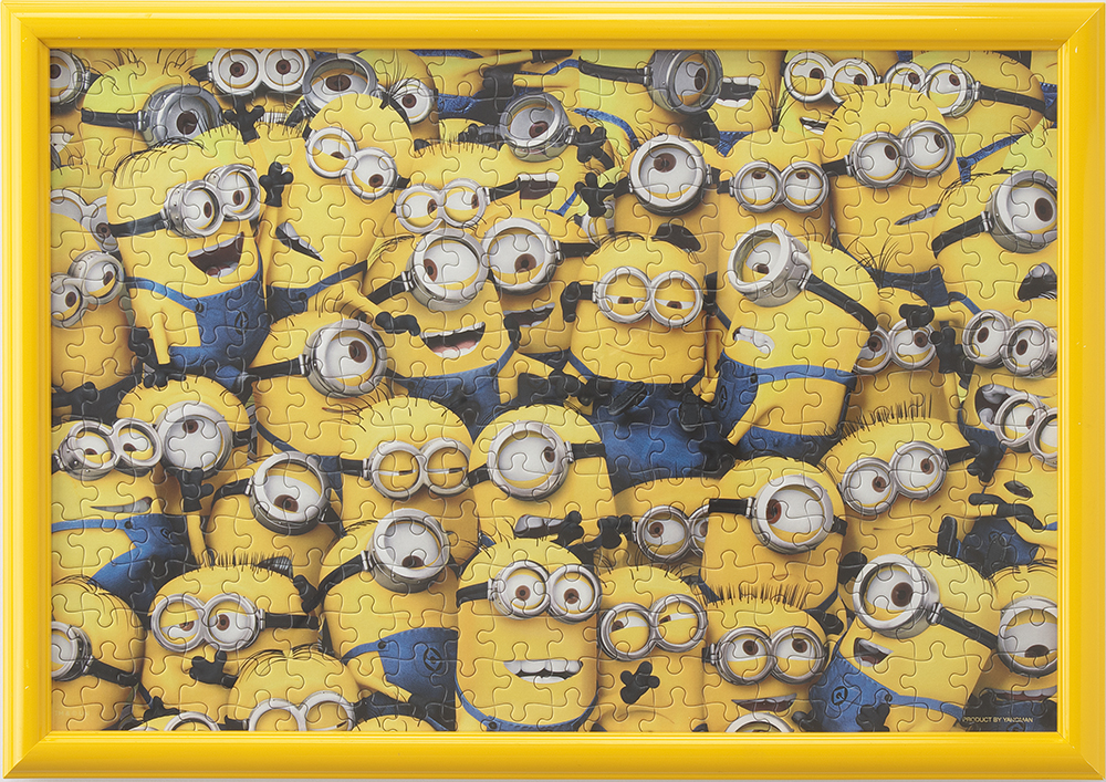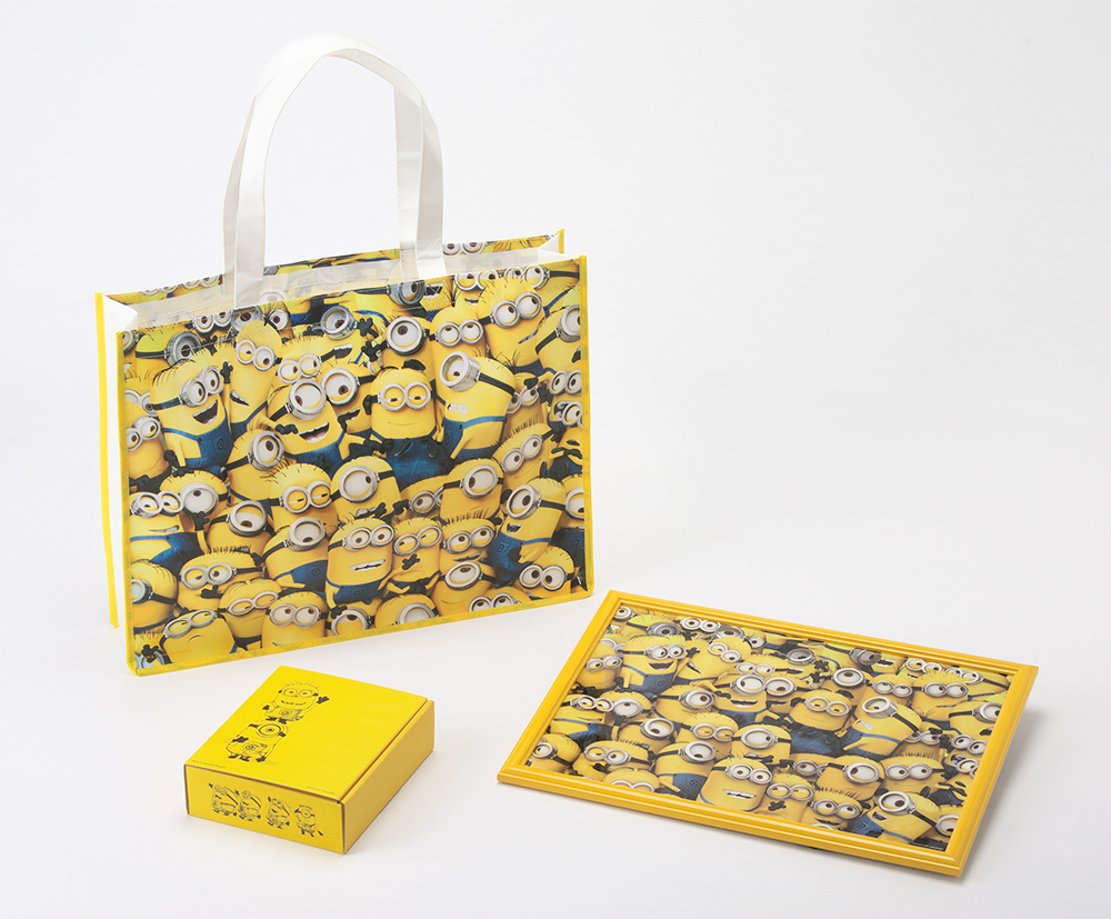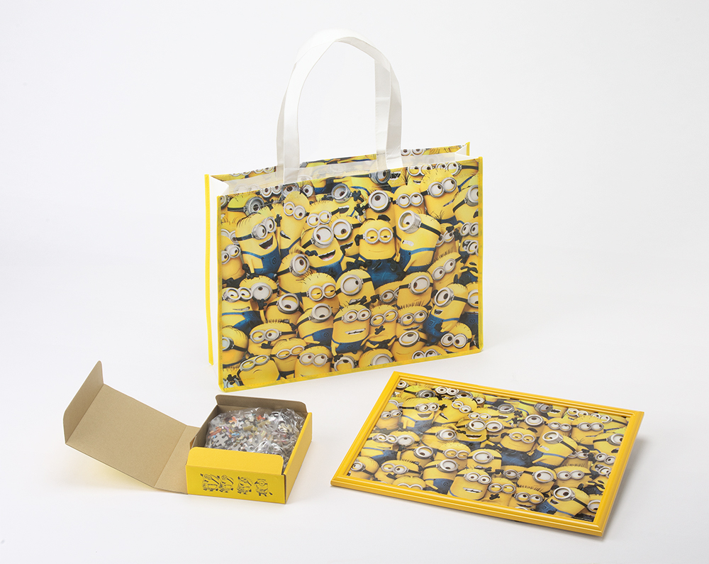 【ミニオン ジグソーパズルセット(ミニオンぎっしり)】は大人気キャラクターのミニオンを絵柄とした「300ピースのジグソーパズル」とそのジグソーパズルに合うミニオンカラーの「イエローにカラーリングした木製フレーム」、そしてショルダーバッグにもなるジグソーパズルの絵柄と同じデザインの「フレームを持ち歩くためのバッグ」の3点をセットにした【数量限定】の豪華セットです。まさに「ミニオンぎっしり」の同セットはミニオン好きに、ぜひ手に取ってもらいたい製品です。